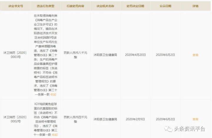 如同母公司一样,华瑞参业的子公司——江苏康神医药保健品有限公司(曾用名:江苏海之巢健康事业发展有限公司、江苏海瑞药业有限公司)也在近期多次遭到过有关部门的行政处罚。2020年2月,该公司因IGY鸡卵黄免疫球蛋白抗菌凝胶的标签(含说明书)不符合《消毒产品标签说明书管理规范》,违反了《消毒管理办法》第三十一条第一款,遭到了沭阳县卫生健康局的罚款。
