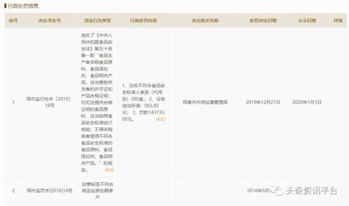 但与此同时,华瑞参业公司在过去的几年里却曾不止一次地遭到过有关部门的行政处罚。2016年5月11日,该公司曾因经营标签不符合规定劣质生晒参片遭到过行政处罚(决定文书号:珲市监罚字[2016]14号)。