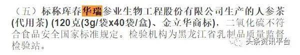 2019年下半年,吉林省市场监督管理厅组织抽检21类食品共888批次样品,本次抽检样品中,合格样品872批次,不合格样品16批次。不合格样品中就包括了标称珲春华瑞参业生物工程股份有限公司生产的带有金立华商标的人参茶(代用茶) ,二氧化硫不符合食品安全国家标准规定。检验机构为黑龙江省乳制品质量监督检验站。
