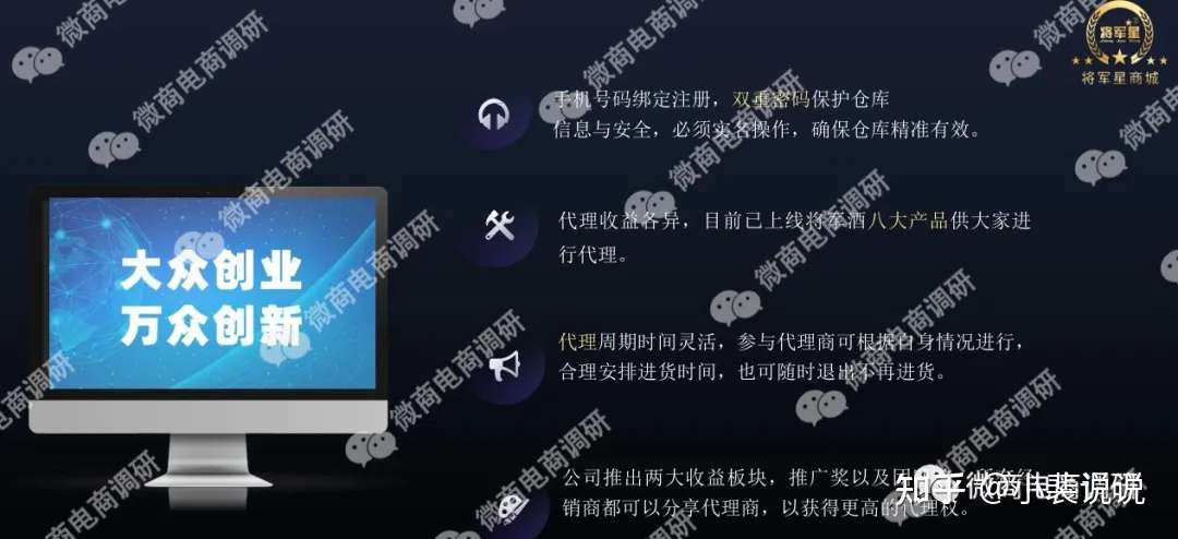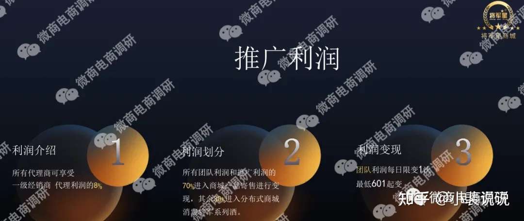 接下来,我们再来看看参与者怎样才能通过将军星商城赚到钱。据经销商提供的PPT资料显示,将军星商城隶属于将军星集团,将军星集团利用其独特的资源,将军酒,将军茶,将军书画院,打造成独特的“一会一院一中心”的合作经营模式。一会即将军星公益基金会,一院即将军书画院,一中心即将军酒文化品鉴中心。政策倡导,全民参与,将军星商城APP门槛低,易操作,奖励高,快速做引流,通过代理激活粉丝市场,教育引流到分布式商城消费,将军典范,酒中精品,从而建立将军酒的品牌建设。