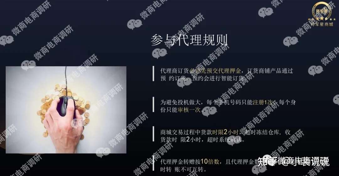 首先,我们来了解一下将军星商城的《参与代理规则》:代理商订货必须先预交代理押金,订货商铺产品通过预约订货,预约会进行智能订货。为避免投机做大,每个手机号码只能注册1次,每个身份只能审核一次。商城交易过程中货款时限2小时,超时冻结仓库,收货款时限2小时,超时系统确认。代理押金转赠按10倍数,且代理押金数额预留100,同时转账不可互转。