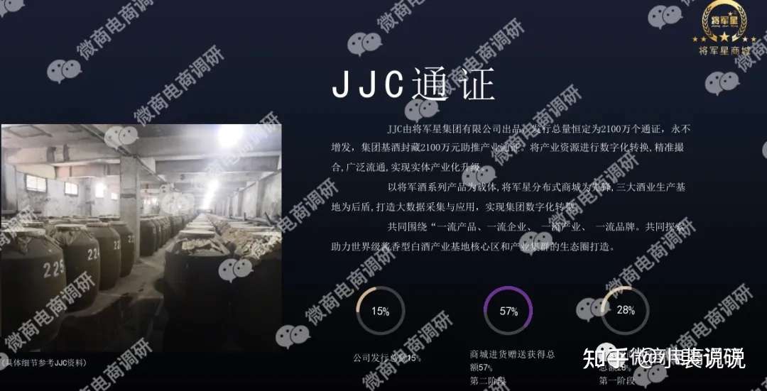 此外,将军星商城还引入了通证概念。据悉,JJC通证由将军星集团有限公司出品,发行总量恒定为2100万个通证,永不增发,集团基酒封藏2100万元助推产业通证。将产业资源进行数字化转换,精准撮合,广泛流通,实现实体产业化升级。公司发行总额15%,分布式商城消费赠送总额28%(第一阶段),商城进货赠送获得总额57%(第二阶段)。