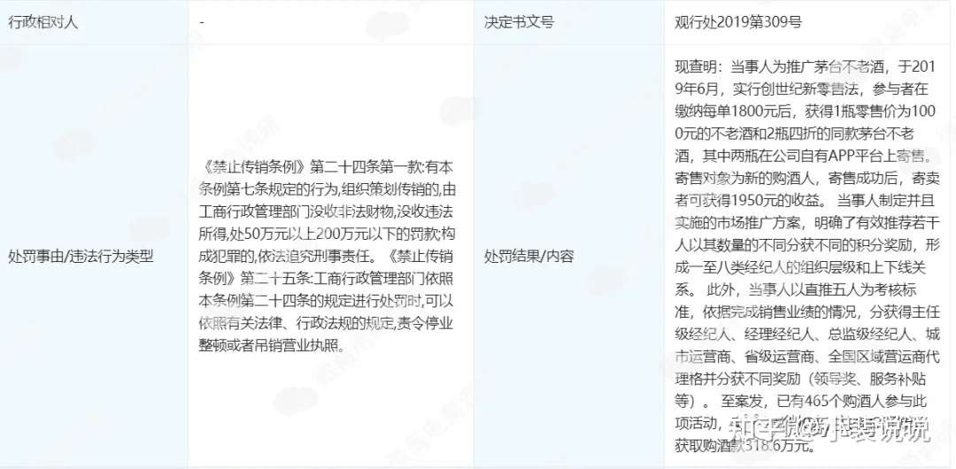 其实,将军星推行的寄售模式早已令人见怪不怪了。很早之前,与将军星一样通过寄售酒产品发家的贵州创世纪龙耀酒业有限公司就因“组织策划传销案”名列贵州省市场监管局发布的“十大传销典型案例”当中。经调查,贵州创世纪龙耀酒业有限公司为推广茅台不老酒,实行“创世纪新零售法”。即参与者在缴纳每单一千八百元后,获得一瓶零售价为一千元的茅台不老酒和两瓶四折的同款酒,可以在公司自有APP平台上寄售,寄售后可获一千九百五十元收益。