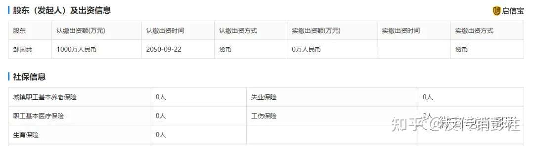 经查,精益车联(北京)数字科技有限公司成立于2020年9月3日,法定代表人和独资股东都是邹国共,据2020年度报告显示,该公司的注册资本为1000万元,而股东的实缴出资额为0元,参保员工也为0人。