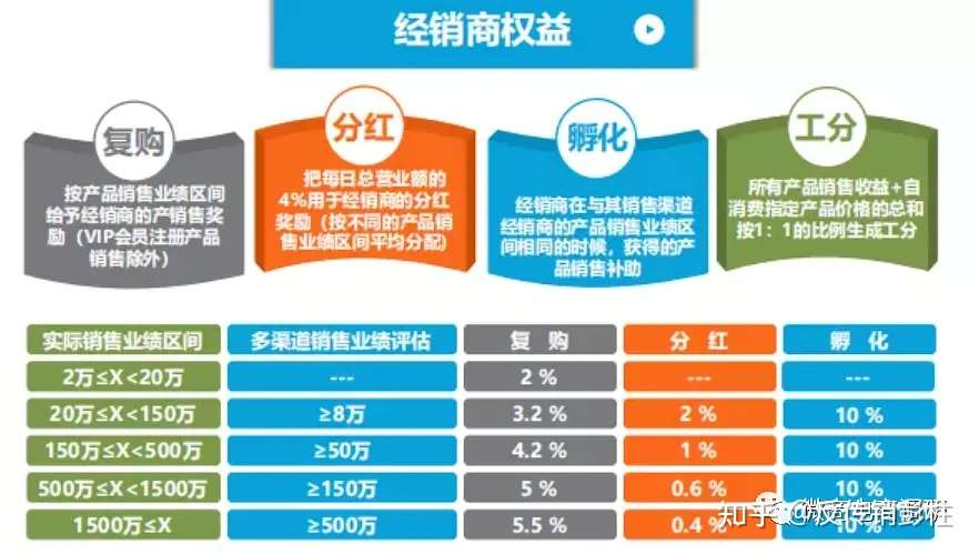 第一,复购:是指按产品销售业绩区间不同,给予经销商不同的产品销售奖励,此奖励不包含VIP会员注册产品的销售;第二,分红:指的是把每日总营业额的4%用于经销商的分红奖励(按照经销商不同的产品销售业绩区间进行平均分配);第三,孵化:是指经销商在与其销售渠道经销商的产品销售业绩区间相同的时候,获得的产品销售补助;第四,工分:是按照经销商的所有产品销售收益+自消费指定产品价格的总和按照1:1的比例生成的,会直接体现在App页面上。