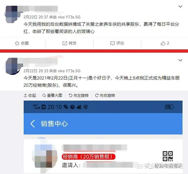 在微博上,也有用户将“关爱之家养车侠的共享股东”的身份和“精益车服20万经销商(股东)”的身份联系在一起。