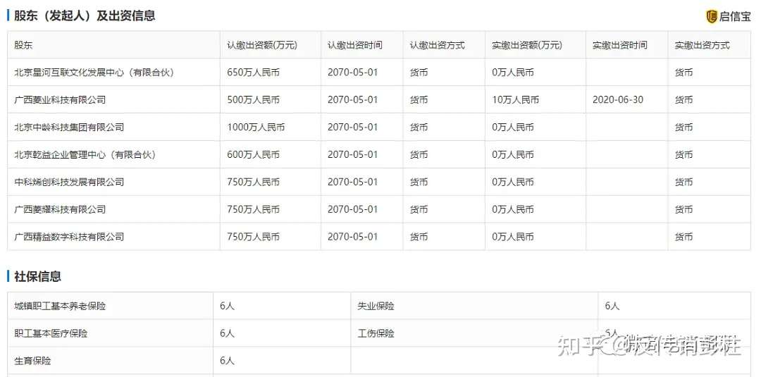 经查,关爱之家科技服务有限公司成立于2020年5月9日,法定代表人龙红成,股东有广西菱业科技有限公司、北京中龄科技集团有限公司、中科烯创科技发展有限公司、北京乾益企业管理中心(有限合伙)、北京星河互联文化发展中心(有限合伙)、广西菱耀科技有限公司、广西精益数字科技有限公司,注册资本5000万元,据2020年度报告显示,该公司股东的实缴出资额仅有10万元,参保员工为6人。