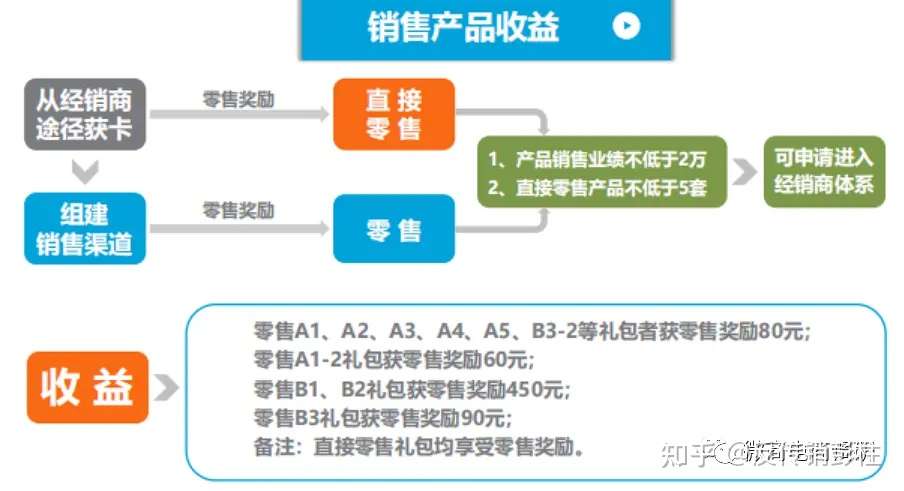 举例说明,首先当经销商的产品实际销售业绩区间在2万到20万之间的时候,不需要任何的多渠道销售业绩评估就可以获得其所销售产品的营业额(除VIP会员注册产品销售营业额以外)的2%作为复购奖励。当经销商的产品销售业绩区间在20万到150万之间的时候,并且该经销商多渠道销售总业绩大于8万,则可获得其所销售产品的营业额(除VIP会员注册产品销售营业额以外)的3.2%作为复购奖励,以及当日全国所有产品销售总营业额的2%平均分配给当日全国所有的销售业绩区间在20万到150万之间的经销商。若此经销商和其销售渠道经销商所在的销售业绩区间相同了,则由其渠道经销商享受此业绩区间的复购及销售奖励,此经销商可获得分红奖励以及其渠道经销商收益的10%作为孵化奖励……以此类推。
