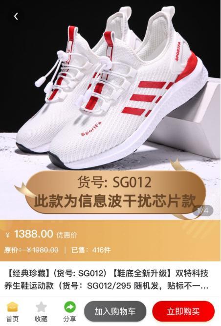 这个所谓的导师和其团队是做什么的?记者添加对方微信后得知,团队主要卖的是“量子鞋”,此外还有很多科技养生产品。而想要加入团队,就要购买一双价值399元的鞋。导师随后发来了一个二维码,记者扫码注册后看到,这是一个网络商城,其中所卖的鞋子有多种档位,399元是最便宜的,最贵的鞋子一双就要1388元。