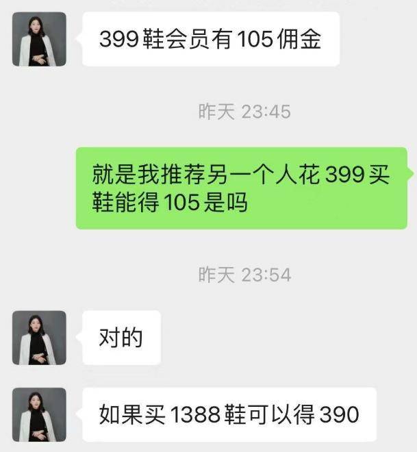 导师称,买一双399元的鞋就能成为会员,可以发展下线获得佣金