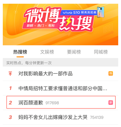 10月17日上午,“润百颜道歉”话题冲上热搜第二位。