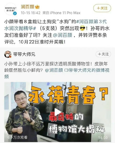 同时,该条微博还转发了网红带带大师兄的微博,在这名网红发布的微博里,带带大师兄探访了润百颜公司的透明质酸博物馆,并制作了一条近15分钟的视频。
