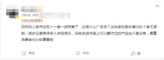 有网友表示,马上就要开启双十一第一波预售了,不知道这种广告词是怎么通过的。