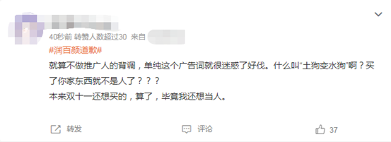 把“土狗变水狗”这种博“出圈”的话术,被品牌方转发,显然是各个环节的监管不严格导致。品牌口碑是一个不断积累的过程,而这不仅仅依靠产品质量,谨慎选择代言“网红”既是对消费者负责也是对产品本身负责,失去消费者的支持,一个简单的道歉恐怕“于事无补”。