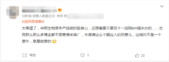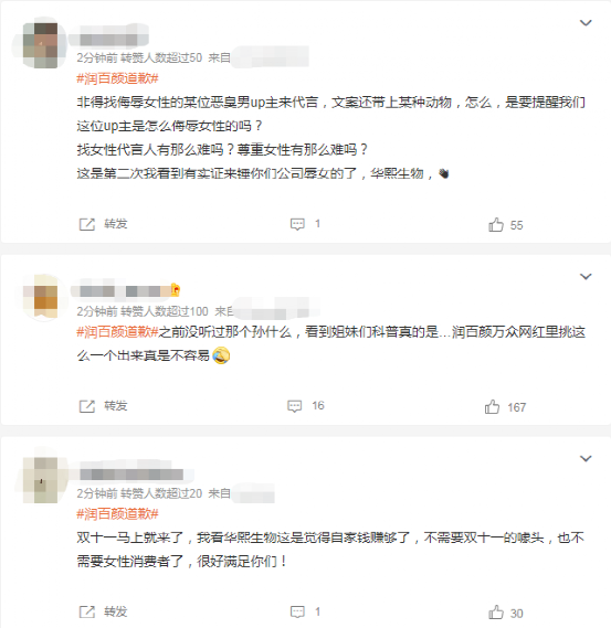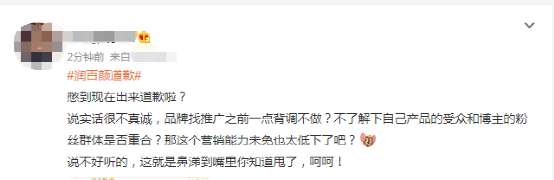 但对于润百颜的道歉,网友似乎并不买账,并质疑公司的这次推广是故意的,道歉也不真诚。