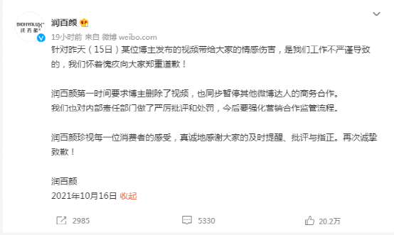 10月16日,润百颜在官方微博发布了道歉声明,全文如下: