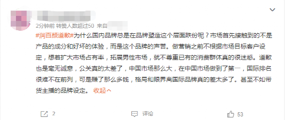有网友认为,公司想着扩大市场占有率,拓展男性市场,却不尊重已有的消费群体。道歉也毫无诚意,赚了那么多钱,格局和眼界离国际品牌差太多,甚至不如带货主播的品牌设定。