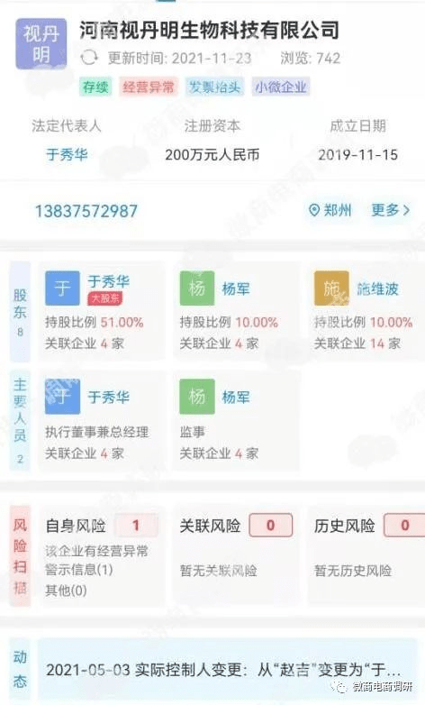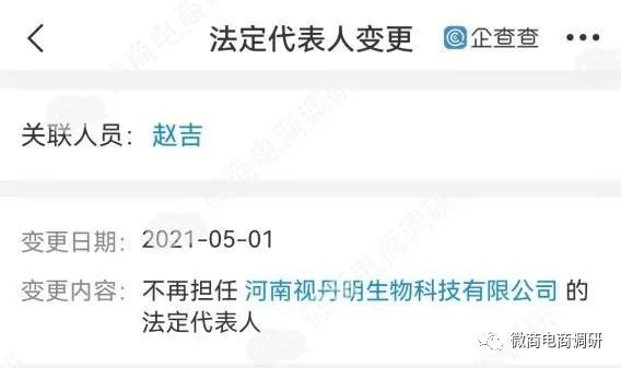 赵吉在2020年12月7日到2021年5月1日之间,担任河南视丹明生物科技有限公司的法定代表人,该企业在2021年3月16日被郑州市金水区市场监督管理局因为通过登记的住所或经营场所无法联系而被列入经营异常名录,赵吉于2021年5月1日不再担任此公司的法定代表人。由此可见,赵吉换了带有“中科”的企业又带着视丹明卷土重来。