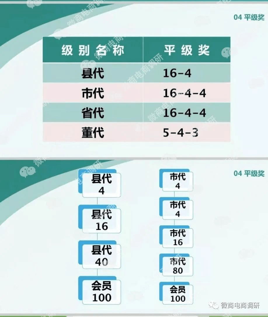 第三个奖励是平级奖:从县代开始到省代都采用分层奖励,每层都从推荐关系最近的上级代理中分出20元的级差。县代分为两层:第一层16元,第二层4元。市代分为三层:第一层16元,第二层4元,第三层4元。省代三层:第一层16元,第二层4元,第三层4元。董事也有分层奖励,共有三层分别是:第一层5元,第二层4元,第三层3元。