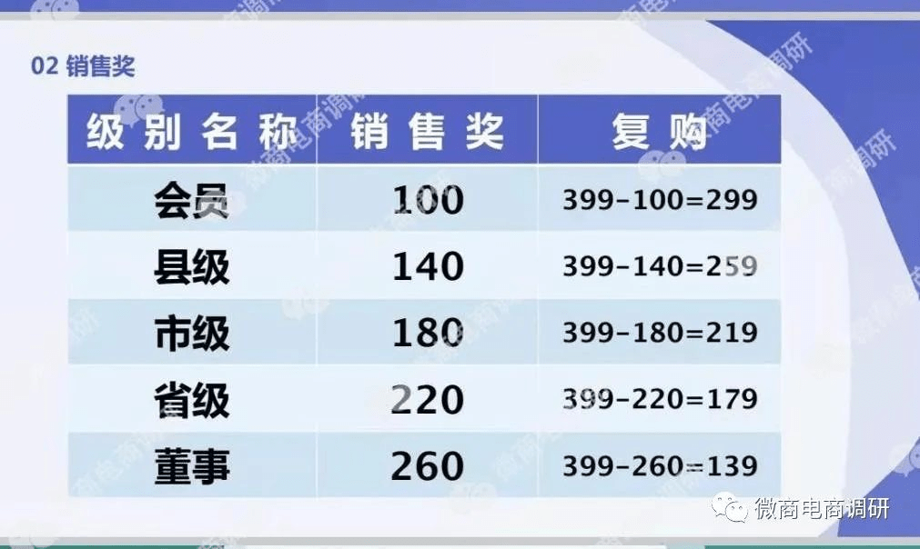 第一个奖励是销售奖:会员销售一盒奖励100元,县代销售一盒奖励140元,市代销售一盒奖励180元,省代销售一盒奖励220元,董事销售一盒奖励260元。