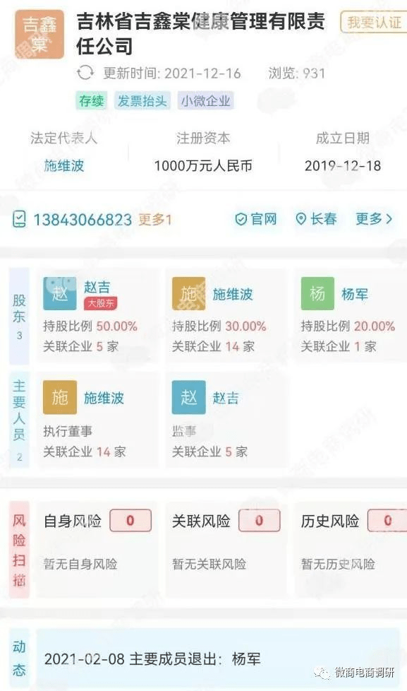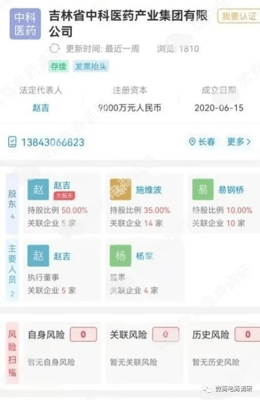 据介绍,视丹明产品质量由picc中国人民保险承保。图片中的承保单位是吉林省吉鑫棠健康管理有限责任公司,经查该公司成立于2019年12月18日,法定代表人为施维波,监事赵吉,注册资本为1000万元,企业地址位于长春市经济开发区,所属行业为批发业。