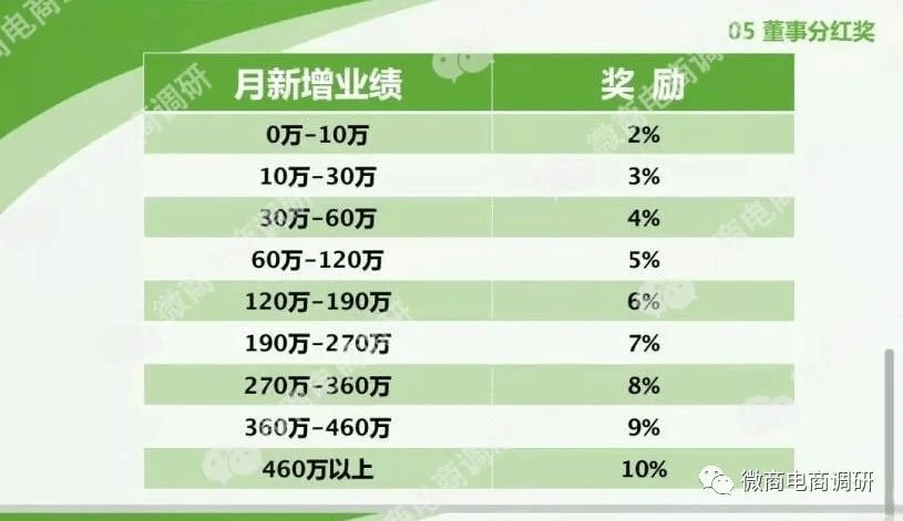 第四个奖励是董事月分红,每位董事除了前三个奖励,每个月还有分红,根据月新增业绩设有9个不同等级的奖励,具体规则是:当本月新增业绩在0万到10万范围内,会奖励董事当月业绩的2%作为分红;当本月新增业绩在10万到30万范围内,会奖励董事当月业绩的3%作为分红;当本月新增业绩在30万到60万范围内,会奖励董事当月业绩的4%作为分红;当本月新增业绩在60万到120万范围内,会奖励董事当月业绩的5%作为分红;当本月新增业绩在120万到190万范围内,会奖励董事当月业绩的6%作为分红;当本月新增业绩在190万到270万范围内,会奖励董事当月业绩的7%作为分红;当本月新增业绩在270万到360万范围内,会奖励董事当月业绩的8%作为分红;当本月新增业绩在360万到460万范围内,会奖励董事当月业绩的9%作为分红;当本月新增业绩超过460万,会奖励董事当月业绩的10%作为分红。