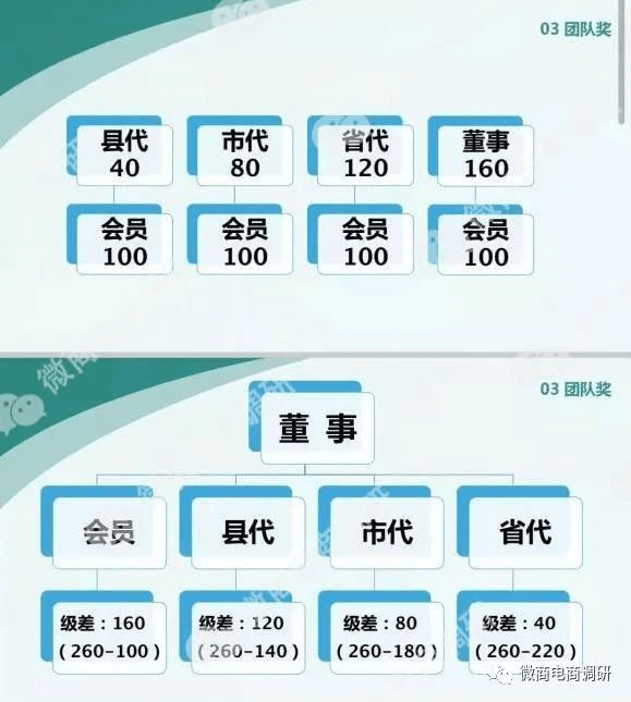 第二个奖励是团队奖,与会员比较,其他等级的代理每卖出一盒视丹明具有的奖励。县代40元,市代80元,省代120元,董事160元。