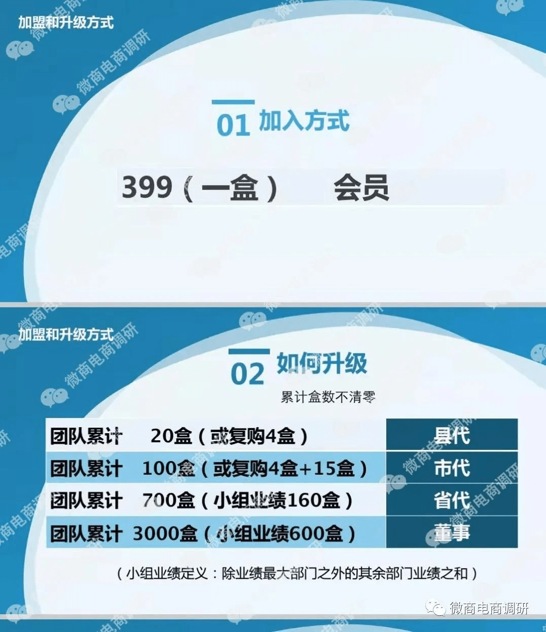 成为会员需要花费399元购买1盒视丹明,享有经营权、发展权、代理权、继承权。成为县代需要花费1595元(399+299*4=1595)复购4盒视丹明或者团队销售累计20盒。成为市代需要花费5480元(399+299*4+259*15=5480)复购4盒+15盒视丹明或者团队销售累计100盒。成为省代需要小组业绩累积160盒或者团队销售累计700盒。成为董事需要小组业绩累积600盒或者团队销售累计3000盒。