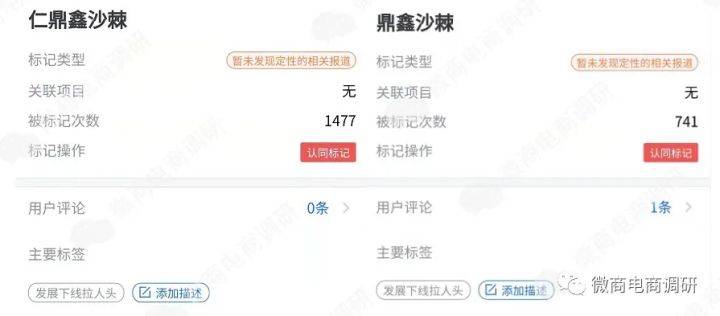 眼下,在腾讯灵鲲金融风险监管平台当中,“鼎鑫沙棘”和“仁鼎鑫沙棘”已被标记了成百上千次,且主要标签都有“发展下线拉人头”的字样。
