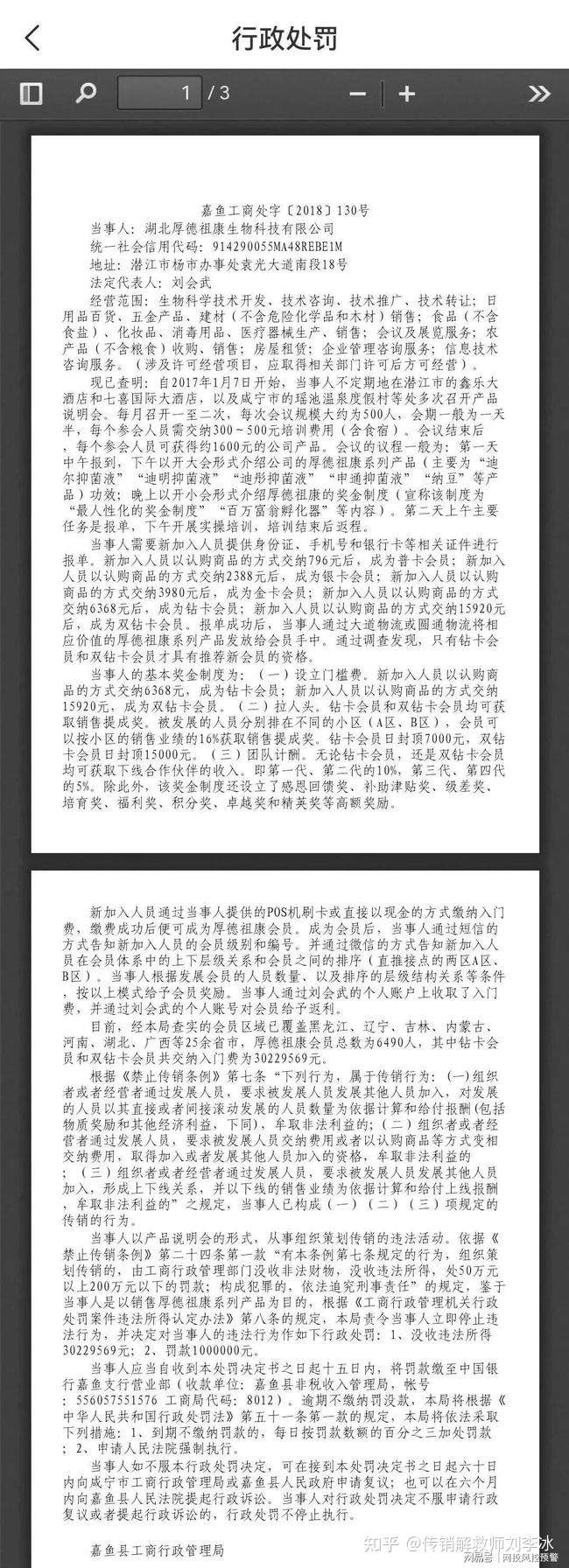 2018年9月5日,湖北厚德祖康生物科技有限公司因“其他传销行为”遭嘉鱼县市场监督管理局罚款100万元没收违法所得和非法财务。