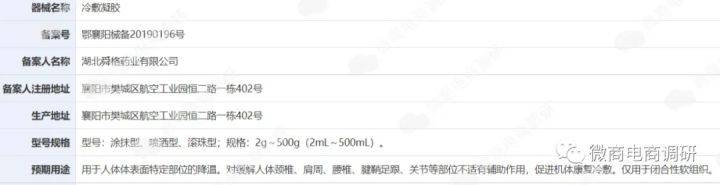 据药智数据网站显示,该备案号对应的产品的预期用途为“用于人体体表面特定部位的降温。对缓解人体颈椎、肩周、腰椎、腱鞘足跟、关节等部位不适有辅助作用,促进机体康复冷敷。仅用于闭合性软组织。”
