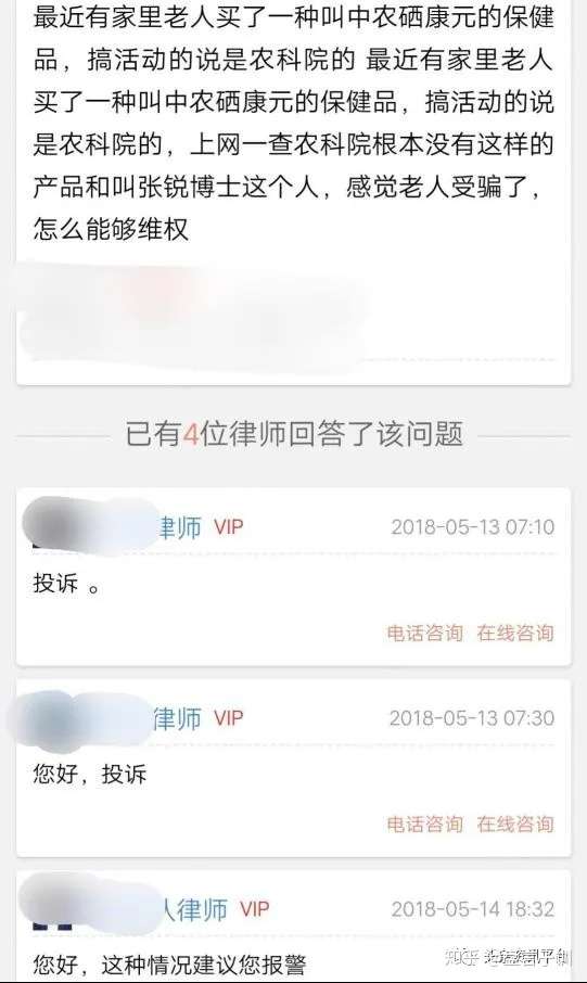 颇为值得注意的是,早在两年前,就有网友在“110法律咨询网”平台上留言,说家里老人买了这款产品,感觉上当受骗。对此,有四位律师在该网友的留言下表示受害人可以投诉或者报警处理。