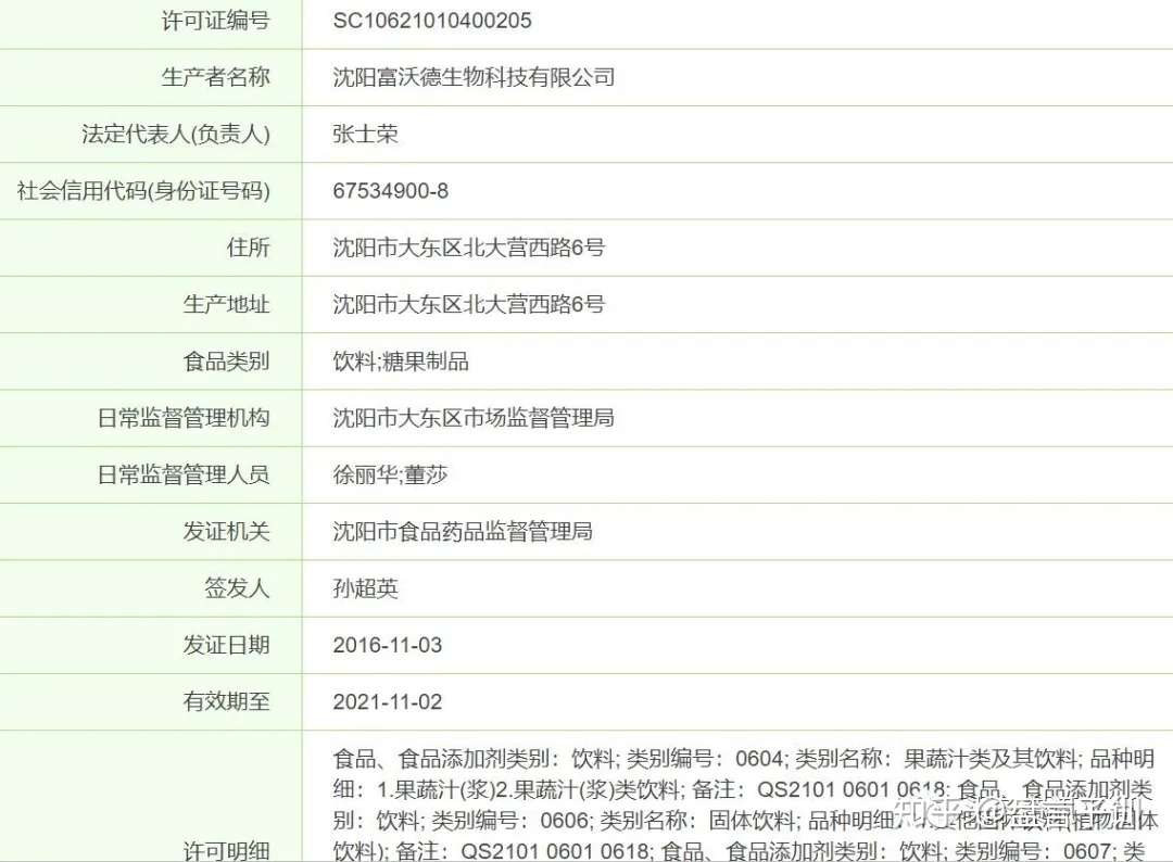 生产“中农硒康元富硒食用菌片”产品的沈阳富沃德生物科技有限公司也同样值得关注。经查,沈阳富沃德生物科技有限公司于2008年9月2日成立,注册资本为2008万元,实缴金额为60万元,法定代表人张士荣,监事张荣欣。公司的经营范围包括糖果制品(糖果)、饮料(果汁及蔬菜汁类、固体饮料类、其他饮料类)等。
