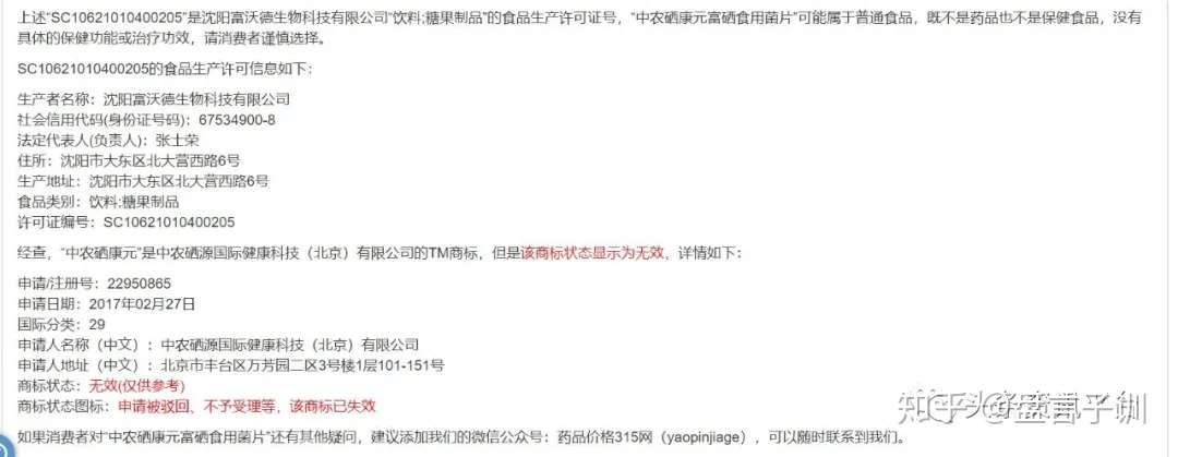 对此,药品价格315网回复道:上述产品是由沈阳富沃德生物科技有限公司生产,食品生产许可证号为SC11322240340646,属于食品类别中的“饮料;糖果制品”,“中农硒康元富硒食用菌片”属于普通食品,既不是药品也不是保健食品,没有具体的保健功能或治疗功效,请消费者谨慎选择。并且经查,“中农硒康元”是中农硒源国际健康科技(北京)有限公司的TM商标,但是该商标状态显示为无效。
