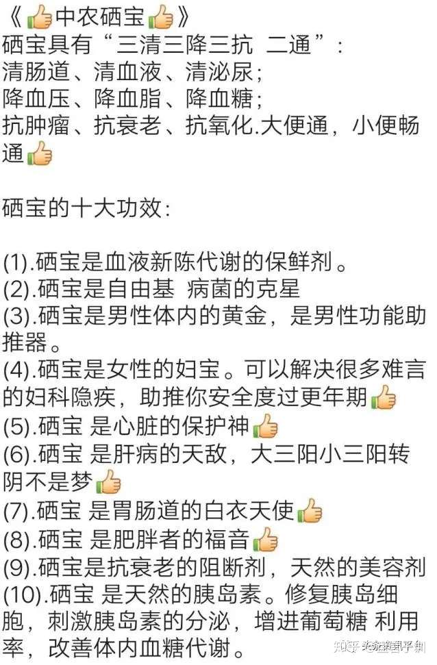 在关于该产品的宣传资料当中,中农硒宝被如此描述:中农硒宝号称具有“三清三降三抗二通”的多种功效:清肠道、清血液、清泌尿;降血压、降血脂、降血糖;抗肿瘤、抗衰老、抗氧化;大便通,小便畅通。此外,它还被夸张地称作是“男性体内的黄金”、“女性的妇宝”、“心脏的保护神”、“肝病的天敌”、“胃肠道的白衣天使”、“肥胖者的福音”等。