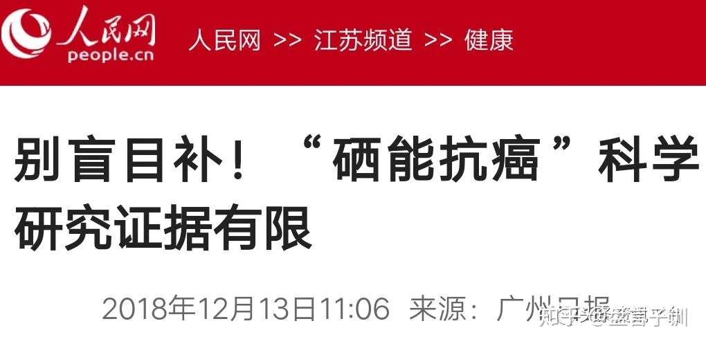 最后,我们再说回近年来屡次在互联网上掀起讨论热潮的“补硒”这个话题。“补硒”真的能抗癌吗?人们有必要“补硒”吗?早在2018年,《广州日报》就对此发表了一篇文章,文章指出:硒是否有那么强大的抗癌功效,目前研究结果尚未达成一致,有的研究结果表明硒能降低某些癌症的发病率,有的研究结果却否定了这种结论。所以,硒能抗癌的科学研究证据还很有限。