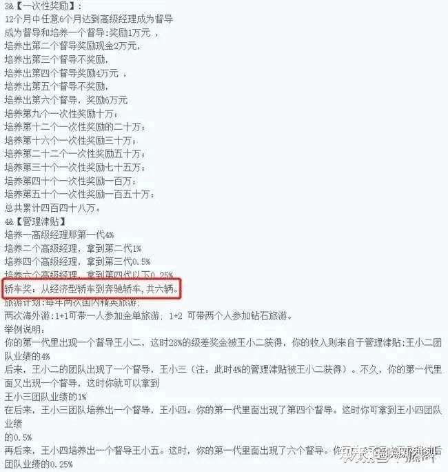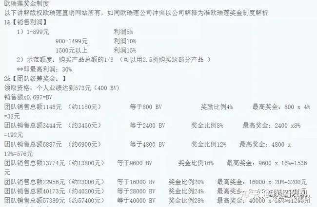 根据资料显示,欧瑞莲奖励机制共分为销售利润、团队级差奖金、一次性奖励、管理津贴几个奖项,每个级别都有消费门槛及拉新人参与要求。同时,根据消费额度提升或者拉人则可以晋升级别,每晋升一个级别则拥有更多的回报。以消费做为入会门槛,按照团队计酬和拉人头晋升模式,根据《禁止传销条例》的规定,欧瑞莲已经涉嫌传销。