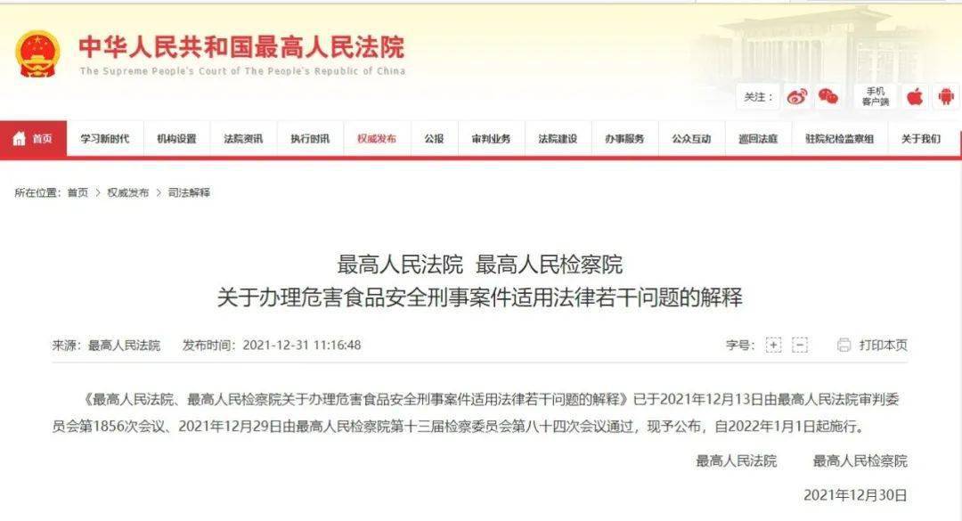 《最高人民法院、最高人民检察院关于办理危害食品安全刑事案件适用法律若干问题的解释》已于2021年12月13日由最高人民法院审判委员会第1856次会议、2021年12月29日由最高人民检察院第十三届检察委员会第八十四次会议通过,现予公布,自2022年1月1日起施行。
