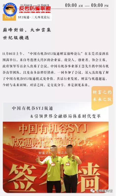 11月6日上午,“中国有机谷SYJ版通财富巅峰论坛”在东莞君濠酒店圆满举行。