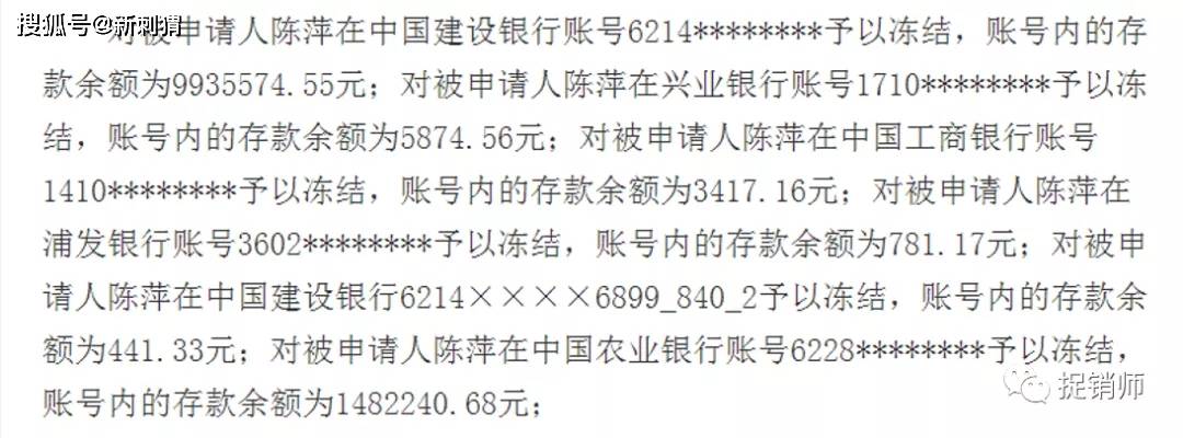 其中值得注意的是, 对被申请人陈萍在中国建设银行账号6214********予以冻结,账号内的存款余额为9935574.55元;对被申请人陈萍在兴业银行账号1710********予以冻结,账号内的存款余额为5874.56元;对被申请人陈萍在中国工商银行账号1410********予以冻结,账号内的存款余额为3417.16元;对被申请人陈萍在浦发银行账号3602********予以冻结,账号内的存款余额为781.17元;对被申请人陈萍在中国建设银行6214××××6899_840_2予以冻结,账号内的存款余额为441.33元;对被申请人陈萍在中国农业银行账号6228********予以冻结,账号内的存款余额为1482240.68元。