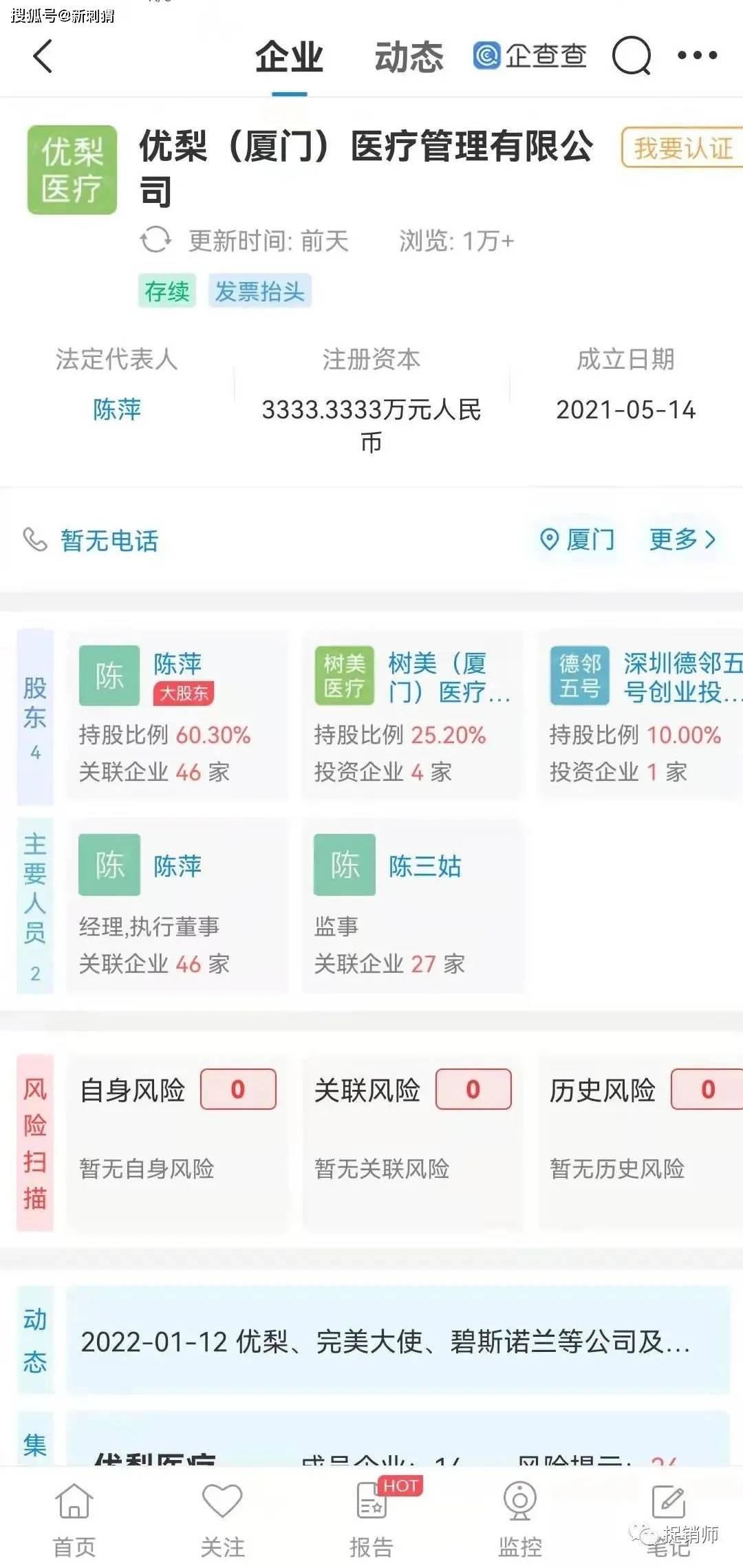 其中本次遭冻账的厦门思明优梨口腔门诊部有限公司成立于2020年11月25日,优梨(厦门)医疗管理有限公司持股100%,法人陈萍,监事陈三姑。