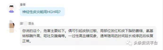 关于长期使用HGH凝胶的危害,古县人民医院的梁医生则回复称:“偶可引起皮肤过敏、局部位发红和皮下脂肪萎缩、氨基转移酶升高、呕吐及腹痛等。”