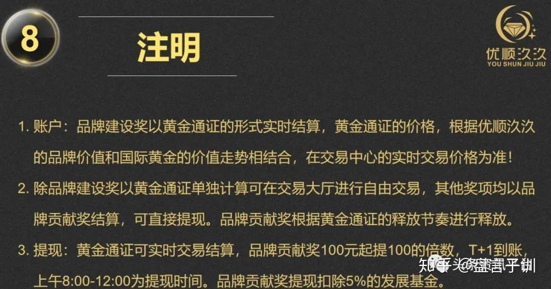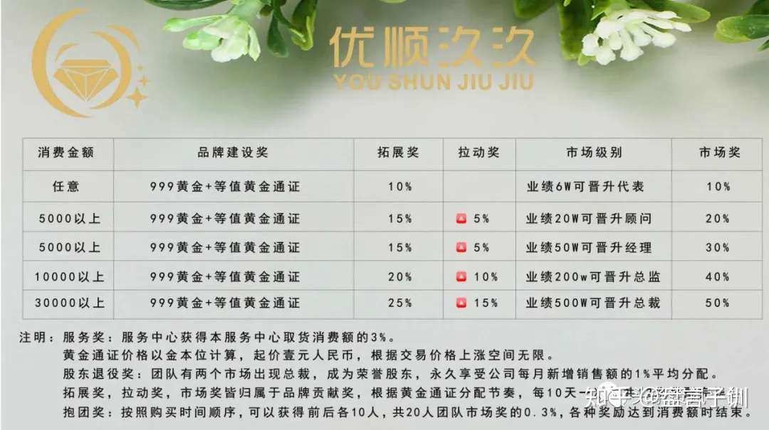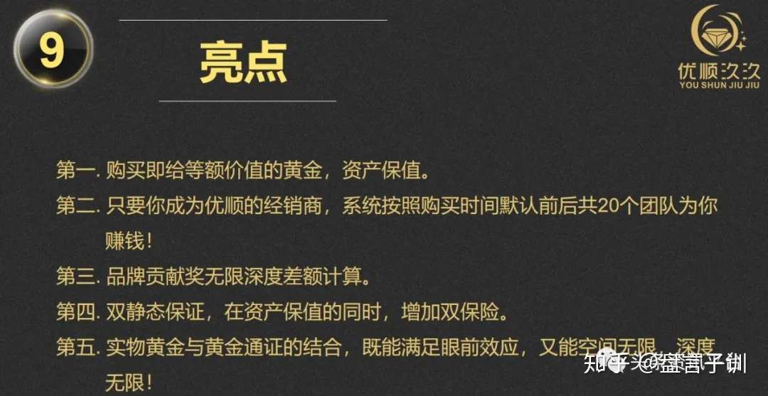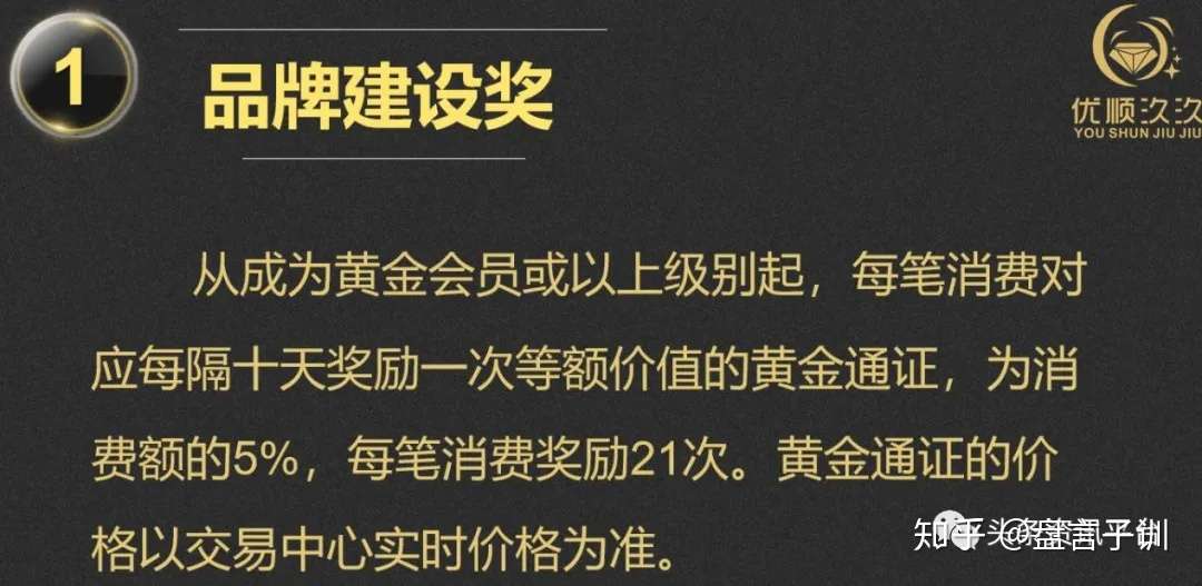 第一, 购买即给等额价值的黄金,资产保值;第二,只要你成为优顺的经销商,系统按照购买时间默认前后共20人的团队为你赚钱;第三,品牌贡献奖无限深度差额计算;第四,双静态保证,在资产保值的同时,增加双保险;第五,实物黄金与黄金通证的结合,既能满足眼前效应,又能空间无限,深度无限。