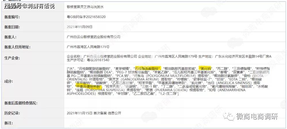其次,微易新零售第二款主打产品是敬修堂黑灵芝首乌洗发水,俗称小黑瓶。据调查,该款产品外包装上显示的证书编号粤G妆网备字2021658320,由此可见这只是一款普通化妆品,并不是国产特殊用途化妆品,我们从国产普通化妆品备案信息网上调查得知,敬修堂黑灵芝首乌洗发水含有“月桂醇聚醚硫酸酯钠”,它的作用是清洁,但是它的刺激性很强,而且会破坏头发油脂的分泌,让保护的屏障受到损坏,所以容易出现干枯和分叉的问题,还会增加掉发的现象,而且此款洗发水还含有“氯化钠”,这个成分一般会被当做增稠剂,放在洗发水内,不仅会导致脱发,还会使头皮干燥发痒,异常难受,严重的话还会导致脂溢性皮炎。值得注意的是,成分表中竟然还有“甲基氯异噻唑啉酮”,欧盟已经限制使用此款成分,这个成分它是经过化学工艺提炼的,也可以看成是一种防腐剂,但它的致敏性很高,且有一定致癌性,如果使用它会导致头皮瘙痒,然后出现脱屑的问题。