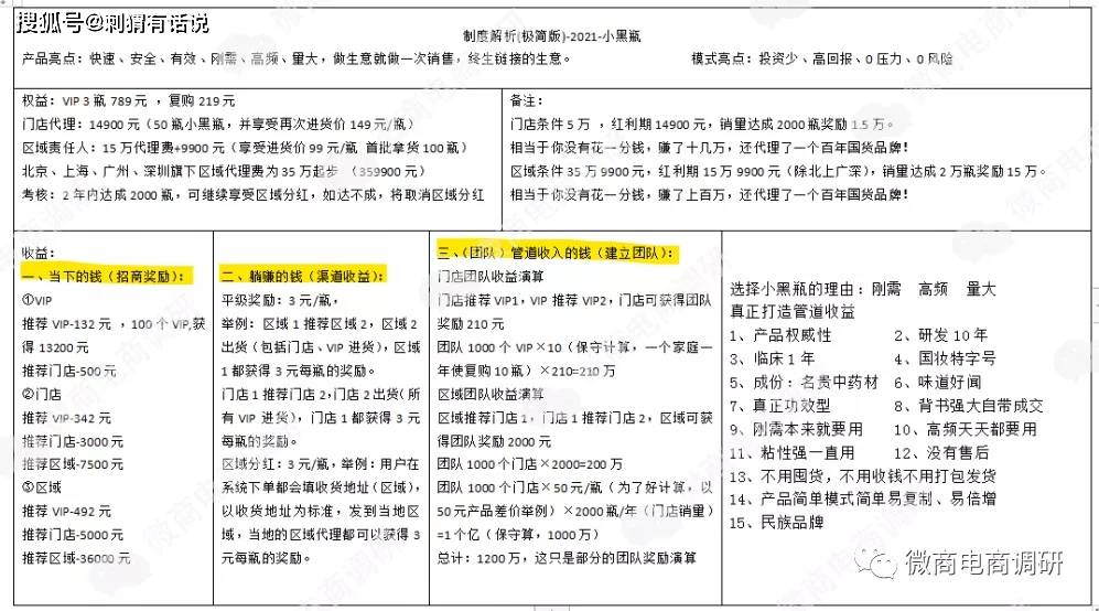 微易新零售将小黑瓶代理分为VIP,门店代理和区域责任人三个级别:VIP需消费789元购买3瓶小黑瓶即可成为VIP,享受复购价219元;门店代理需缴纳14900元,拿货50瓶,享受进货价149元/瓶;区域负责人需缴纳15万代理费,还需额外缴纳9900元,享受进货价99元/瓶,首次拿货100瓶。此外,北京、上海、广州、深圳旗下的区域代理费需35万元以上,2年内达成2000瓶,即可享受区域分红。