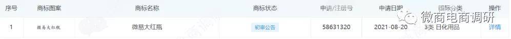 据企查查显示,东莞微易网络科技有限公司于2021年8月申请了微易大红瓶的商标,商标分类为日化用品,但目前商标状态是初审公告。而广州白云山敬修堂药业股份有限公司旗下的一款洗头膏正是大红瓶,这款产品也是微易新零售的主打产品之一。