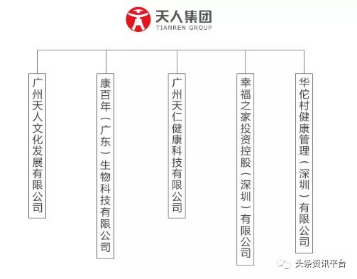 经查,广东天人健康产业集团有限公司于2017年11月15日成立,法定代表人胡海军,注册资本3000万元,据年报显示,参保员工仅两人,股东有胡薇(大股东)、胡馨怡。据官网介绍,广东天人健康产业集团旗下拥有广州天人文化发展有限公司、康百年(广东)生物科技有限公司、广州天仁健康科技有限公司、幸福之家投资控股(深圳)有限公司、华佗村健康管理(深圳)有限公司等5家全资子公司。