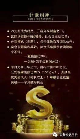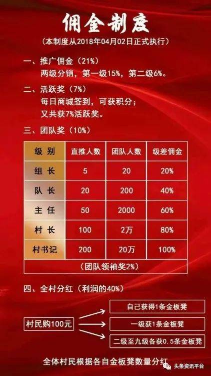村民购产品100元:1、自己获得1条金板凳,也就是说,自己消费,都可以参与全村分红;2、一级获得1条金板凳;3、二级至九级,各获0.5条金板凳。(全体村民根据各自金板凳数量分红)