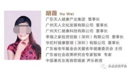 说到胡薇,此人除了天人集团董事长的身份外,其头顶还挂有不少头衔,比如中国音乐家协会会员、中国社会艺术考级委员会考官、声乐表演艺术教授、女高音歌唱家,广东省优秀音乐家、国家二级心理咨询师、《胡薇五音养生疗愈法》创始人、《胡薇五音养生疗愈法》特训导师、广东省老年基金会关爱老年健康基金委员会主任等。