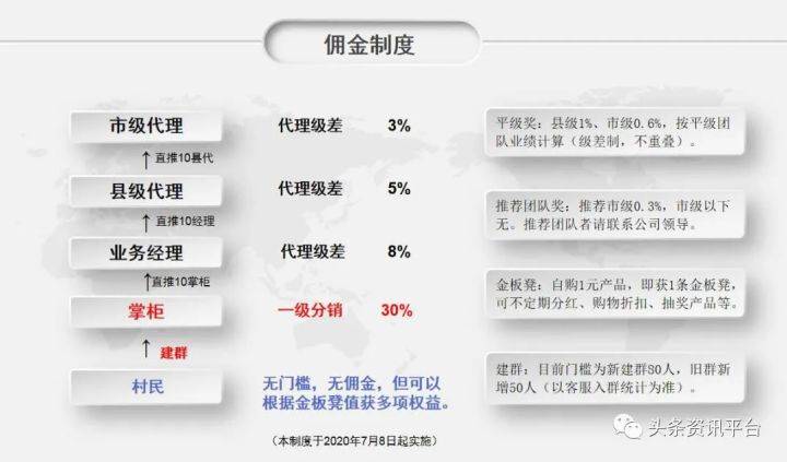 近期,据“华佗村”客服经理透露,为了更好地发展,公司在半个月前用新的代理制度替换了上述的旧代理制度,并于2020年7月8日起实施,无门槛、无佣金、可以根据金板凳值获多项权益是新制度的主要特点。
